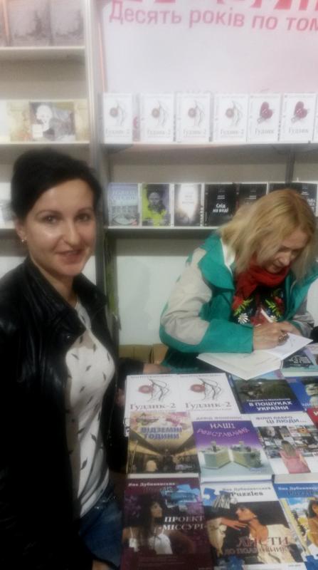 И, пожалуй, один из самых приятных эпизодов поездки – встреча с Ирен Роздобудько! Ее я читаю, еще с времен публикаций в журнале «Натали». Ее первый «Гудзик» стоит у меня на полке, приобретенный, кстати, на книжной выставке в Чернигове. И вот, спустя 10 лет вышел второй. В тот момент, когда я его покупала как раз подошла Ирен и спросила встревоженно у женщин-продавцов стенда «Нора-друк»: «Ну, как?» А те: «Да, просто отлично! Уже почти все распродали!» Я брала у них 2 книги – «Гудзик-2» и «Київ-Париж» Богдана (Боб) Образа (погуглите, если не знаете), у меня не хватило 7 гривен – это были уже последние деньги и мне сбросили)) Спасибки им! Также сказали подходить к 17.00 за автографом. Естественно после Кошкиной я туда пришла и попросила девочек-фанов Ирен сделать мне фотку на телефон.
