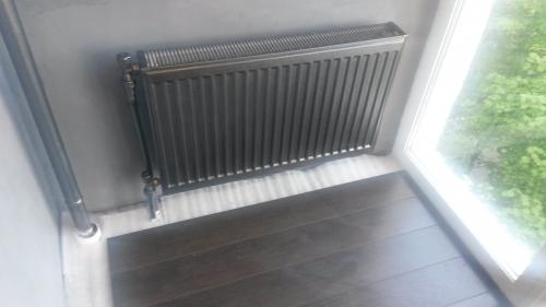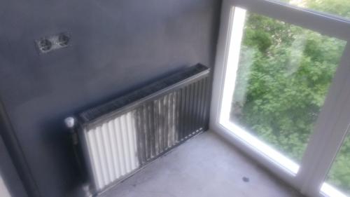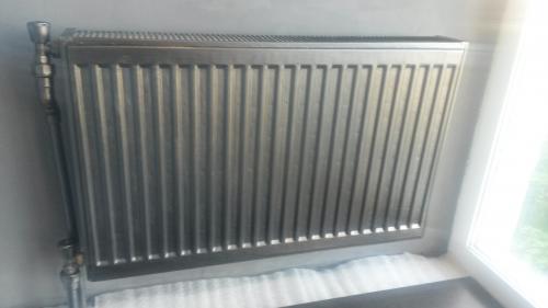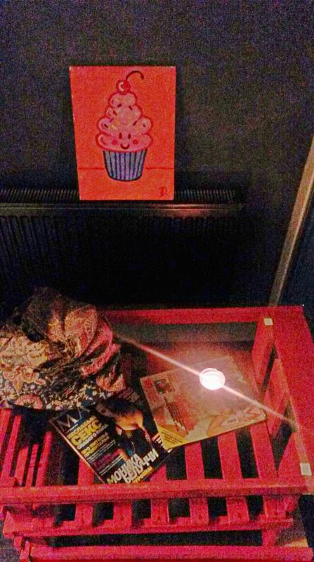 Стол стоит возле батареи, как видите, тоже выкрашенной в серебристый цвет. Банка такой краски стоит в Вене 57 грн, хватило на батарею и трубы в 3 слоя, хотя баночка по виду маленькая, еще и осталось. В белом цвете – это все скучновато смотрелось)) На батарее позирует моя картина, что купила ее за 5 баксов, так как закуток для распития кофе/чая по утром с десертиками, то думаю этот кейк будет как нельзя в тему на стене.