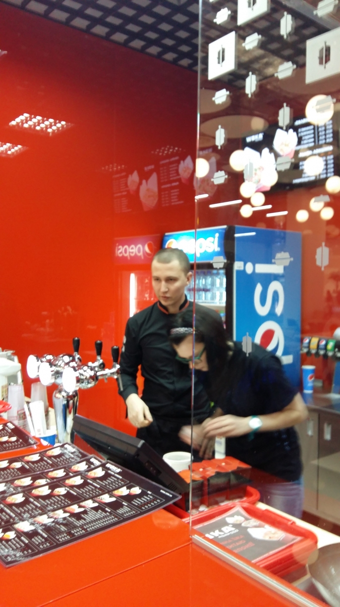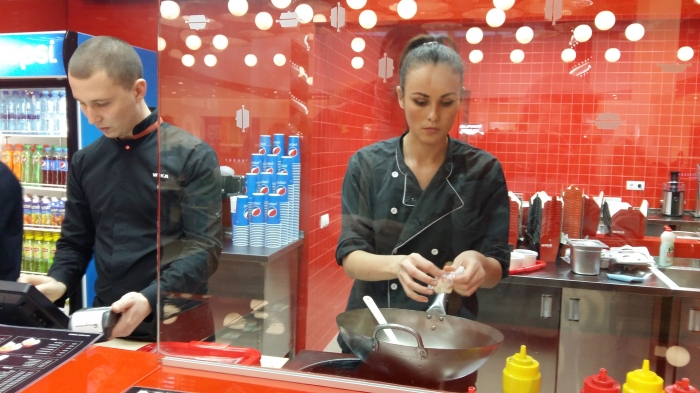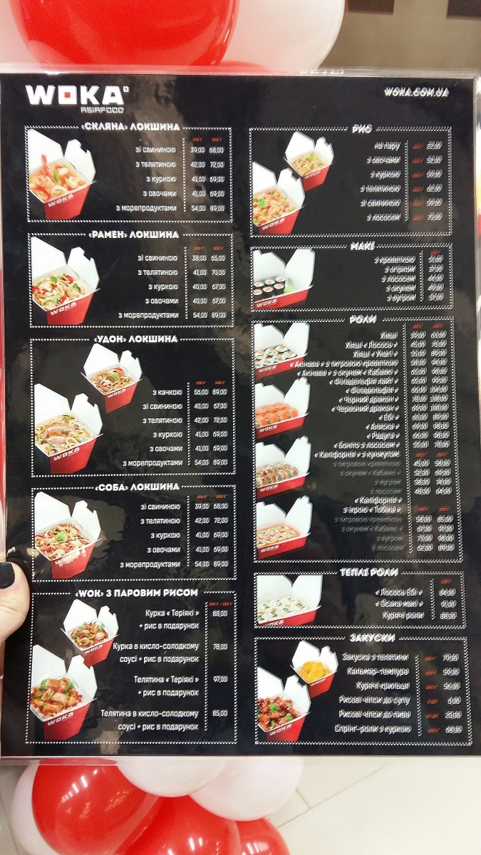 Меню можно посмотреть на ламинированых листах на стойке, где с двух сторон с фото блюд с наименованиями и ценами, либо на двух телевизорах, висящих на стене. Помещение, которое видно через стеклянную стену обложено красной квадратной плиткой, и есть еще одна комната, куда ведет красная дверь. Посетители могут видеть, как в глубоких сквородках-воках три девушки-повара и 1 мужчина-повар готовят начинку-зажарочку к лапше и рису. Администратор, что принимает заказы – парень. Все одеты в форму черного цвета.