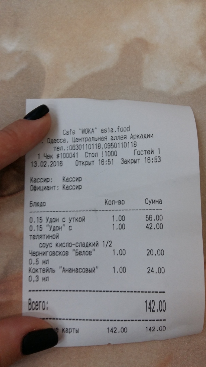 Мы выбрали «Удон». Один с уткой, второй – с телятиной. За 150 грамм утиного – пришлось отдать 56 гривен, за такую же порцию телячьего – 42 гривны. Большая порция каждого блюда, уже по 300 грамм, стоит соответственно 89 и 72 гривны. 0.5 белого пива – 20 гривен, 300 грамм молочного коктейля с ананасом – 24 гривны.