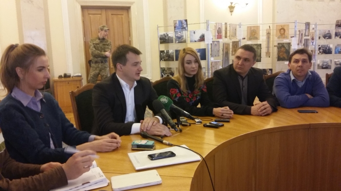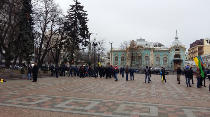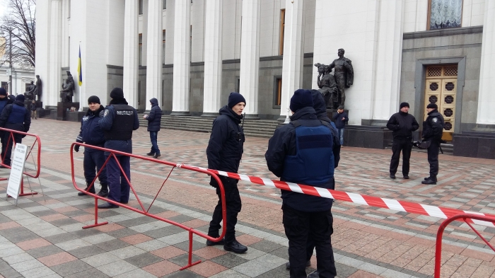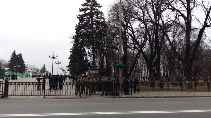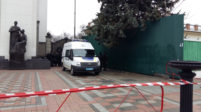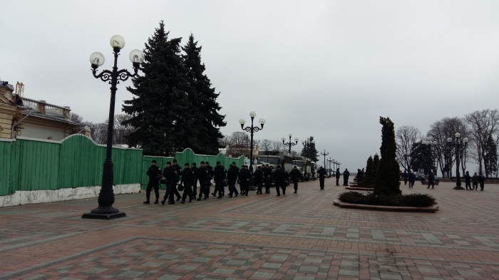 Забросив вещи в автобус, отправились в здание под куполом. Около 9 утра на площади перед ВР было еще пустовато. Но, отряд полицейских, зная о том, что митинги здесь практически каждый день, вдруг, откуда ни возьмись бодрой колонной по двое, со шлемами в руках и дубинками на поясах, вынырнул из-за припаркованных напротив Мариинского парка автобусов и двух кразов. Затем они прошли к фордовскому бусику с надписью «Поліція» и скучковались там, в ожидании, возможных беспорядков.