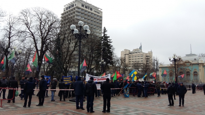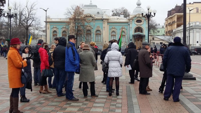 Как по расписанию, буквально через 5 минут появились протестующие. По флагами и плакатам с надписями: «Голодный шахтер – позор Украины», «Львівска територіальна організація профспілки вугільників», «Дзжержинська територіальна організація ПРУПУ» стало понятно, что вишли с требованиями под ВР работники угольной промышленности Украины. Подробно о требованиях Дзержинского ПРУПУ можно прочесть по ссылке: //prupu.org/news/21162/. Если коротко, то из-за закрытия Донецкой железной дороги терпят убытки и могут лишиться работы многие работники угольной отрасли. Но не только шахтеры страдают, от раскола страны, так, стоя в очереди на проходную стала невольным подслушивателем двух столичных журлов. Один из них, после краткого обсуждения футбольного матча (кажись Баварии с Ювентусом) похвастал коллеге, что только вернулся из командировки в Одессу и Николаев, куда журналистов на Черноморский судострорительный завод возил нардеп от оппоблока Вадим Новинский (тот самый, что 6 ноября 2015-го внес несколькомиллионный залог за Лукаш).