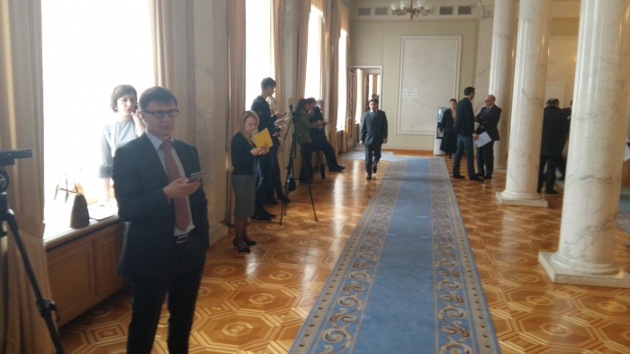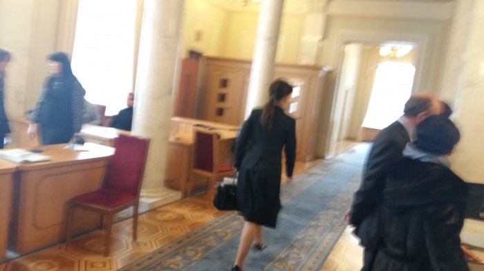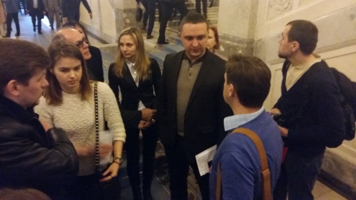 Встреча с нардепами от Черниговщины (Березенко, Кодолой, Евлаховым, Черненко и Романовой) прошла в холле на 3-м этаже, где и проходят различные бриффинги, конференции и совещания депутатских групп. Так, рядом с нами что-то живенько обсуждали нардепы от Черновцов. Через двери холла можно попасть в ложи для прессы, что размещены как бы над сессионным залом, где внизу сидят депутаты.