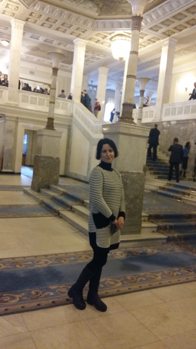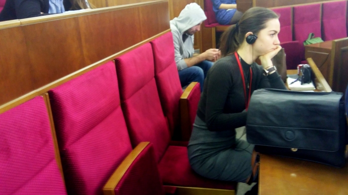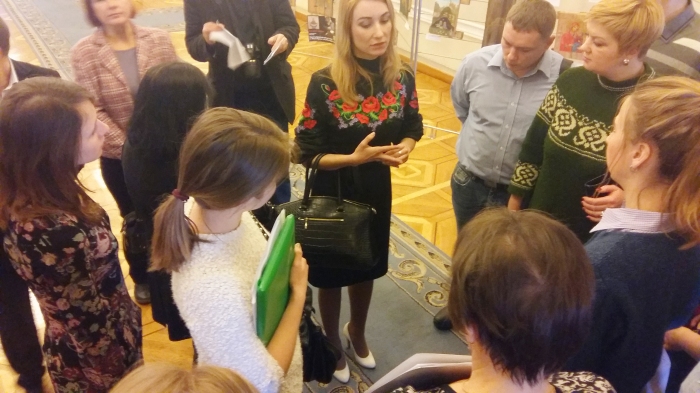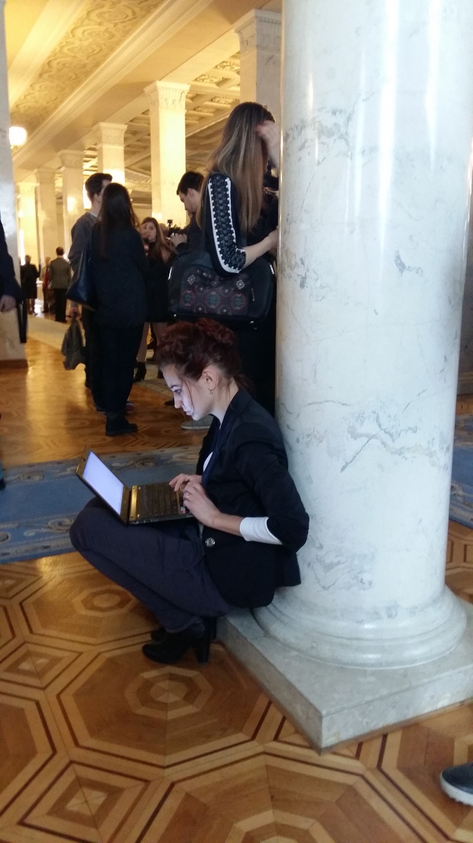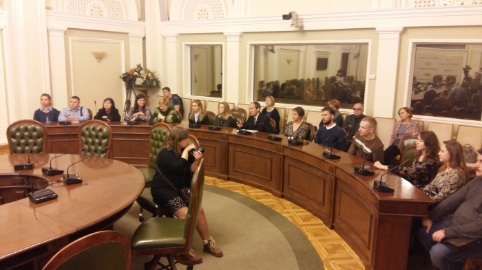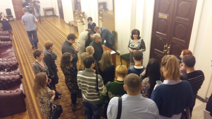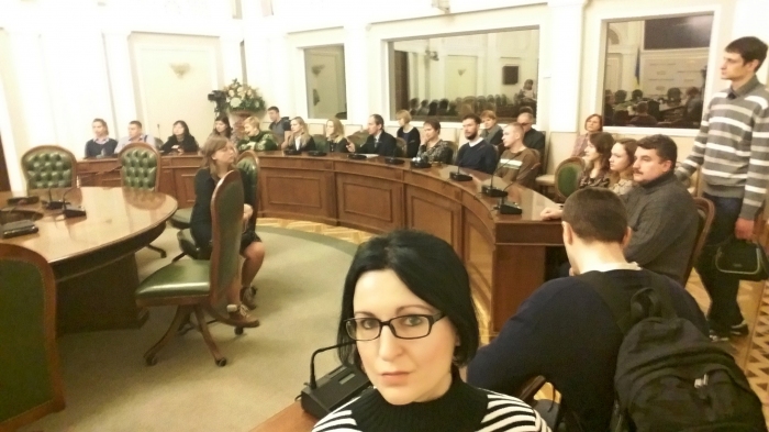 После обеда в столовой у нас по программе шла Школа парламентской журналистки. Запланирована она была с 14 до 16, но по техническим причинам продлилась лишь 1 час, так как второй час в холле третьего этажа с нами должна была пообщаться Ирина Кармелюк руководительница Пресс-службы ВРУ.