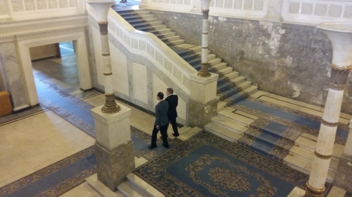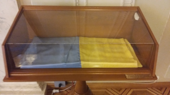 В коридорах Рады достаточно тусклое освещение, у всех люстр на кончике камешек красного цвета. Есть опять же лавка с книгами и кофе-автомат, к которому всегда очередь. Кофе в среднем по 10 грн, наливает до краев, так что облиться – плевое дело. Как сообщил оператор, какого-то канала, есть еще в здании пару кафешек, где можно купить кофе из кофе-машины и не обязательно иметь в наличии купюру, что подходит автомату. Но, чтобы оперативно найти эту кафешку, когда ты там в первый раз, да еще с группой, от которой нельзя отставать – это надо очень постараться.