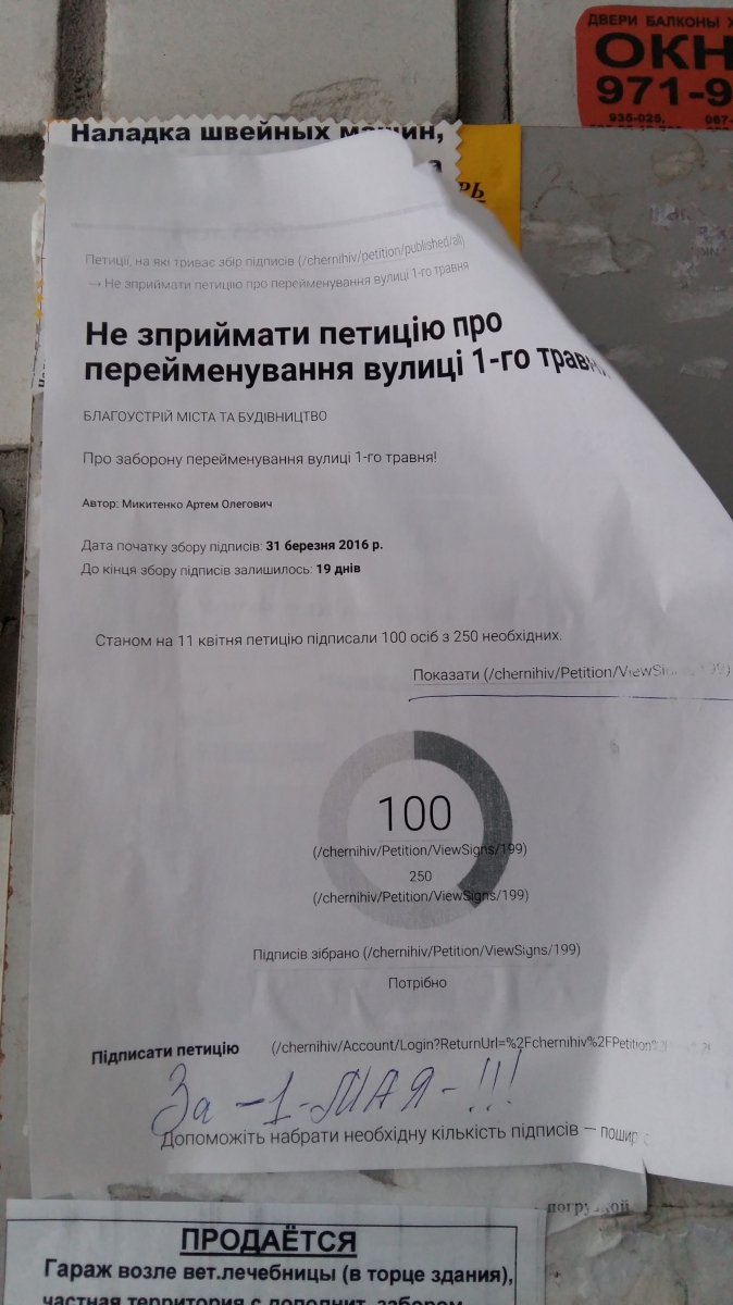 Помимо «иван-иванычей» электронные петиции, естественным образом притягивают и различного рода околопатриотов и поклонников декоммунизации. В апреле обнаружила на доске объявлений своего подъезда вот такую распечатку, с просьбой перейти по ссылке и поддержать: //e-dem.in.ua/chernihiv/Petition/ViewSigns/199.