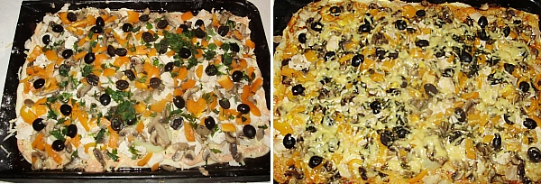 В первый раз соорудила две огромные пиццы с салями и курицей и грибами.