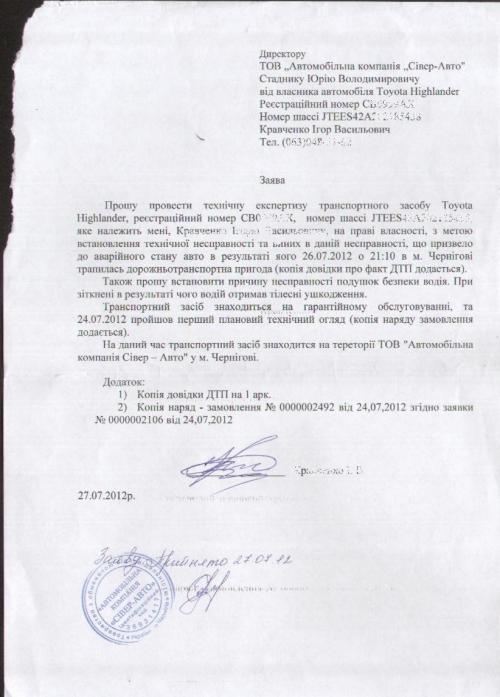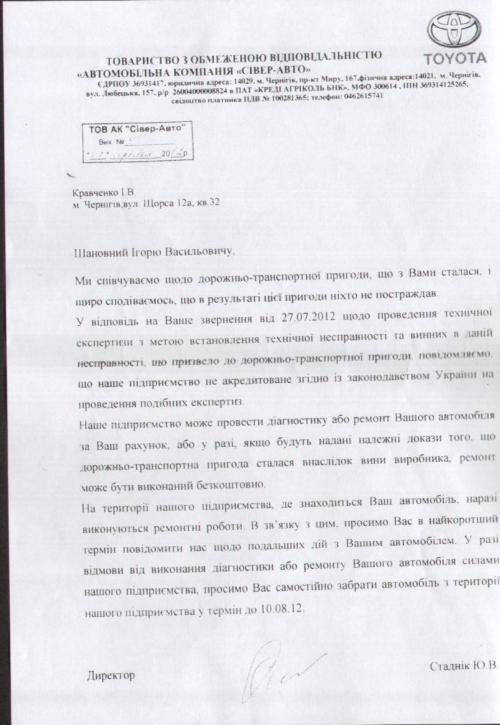Напомним, 26.07.2012г. следуя по проспекту Мира в районе ЗАЗа при повороте на ул. Кольцевую, автомобиль Toyota Highlander стал неуправляемым и в результате чего произошло столкновение автомобиля с электроопорой, автомобиль получил сильные повреждения при этом не одна из подушек безопасности не сработала!!! После ДТП было отправлено официальное заявление к дилеру Тойота ТОВ "Автомобільна компанія Сівер - Авто" в г. Чернигов. (см. фото). Вместо того, чтоб разобраться в ситуации и показать в своем лице качественный сервис и заботу о клиенте, они начали писать «отписки» (см. фото). Так же хотел бы отметить, что компании было предоставлено право выбрать любую экспертную организацию, имеющую лицензию на право проведения таких работ. В связи с официальным отказом компании Тойота в проведении экспертизы, мы обратились в экспертную организацию для проведения независимой экспертизы самостоятельно.