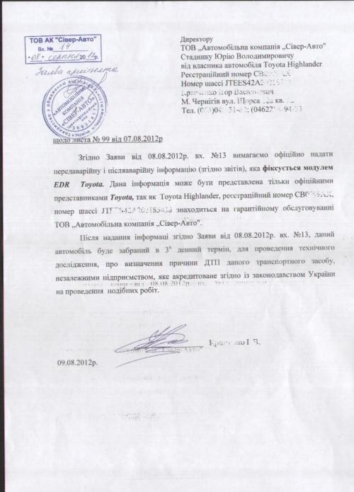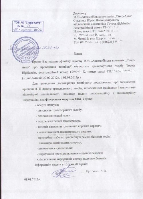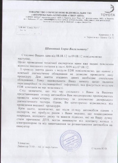Для проведения достоверной экспертизы причины, последствия ДТП и не срабатывание подушек безопасности экспертам необходима информация с модуля EDR («черный ящик»), который записывает большинство параметров автомобиля и поведения водителя за 5 с. до столкновения и после. По требованию эксперта мы направили запрос в ТОВ "Автомобільна компанія Сівер - Авто" с просьбой предоставить нам эту информацию, так как это оборудование Тойоты и автомобиль находится на гарантии и эту информацию должны предоставлять официальные дилеры Тойоты. На что мы опять получили очередную «отмазку» (см. фото).