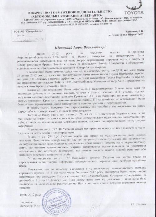 Таким образом, содействия со стороны официального дилера Тойота ТОВ "Автомобільна компанія Сівер - Авто" по определению причины ДТП НЕТ. И вообще такое ощущение, что официальный дилер к продаже и гарантии автомобиля Toyota Highlander не имеет никакого отношения. А может только предупреждать о „що викладена Вами інформація є недостовірною….” і „ В майбутньому просимо Вас утримуватися від подібних висловлювань на нашу адресу, або підтверджувати їх належним доказами” (см. фото).