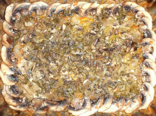 6. Поверх рыбы, вдоль краев формы, уложить нарезанные шампиньоны.