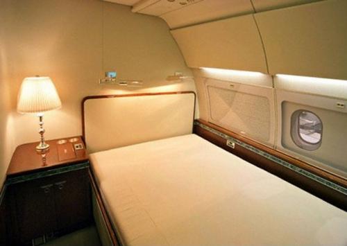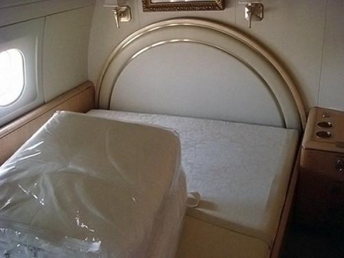 Спальное место в самолете обито дорогой жаккардовой тканью, мягкой на ощупь. Спинка кровати украшена позолотой, над кроватью висит зеркало в золотой раме.