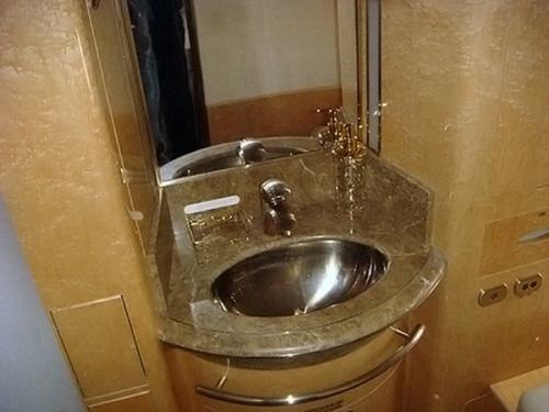 Обивка салона бежевая. Панели, тумбы, столы, шкафы — из залакированных светлого дерева. Светильники, отделка спального места и ванной комнаты позолоченная. В ванной комнате у президента будет позолоченный кран и раковина из розового мрамора.