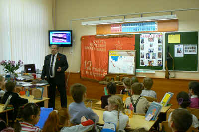 Фото: Председатель Совета ветеранов 12-й Гвардейской Пинской дивизии Игорь Юрьевич Васильев рассказывает о войне ученикам 1-А класса московской школы № 1244. Его отец -- Васильев Юрий Анатольевич, ушёл добровольцем на фронт в 17 лет и прошёл славный боевой путь от Москвы до самого Берлина в составе12 Гвардейской Пинской дивизии.