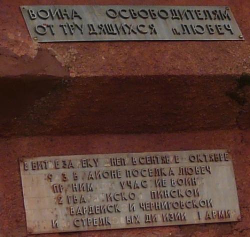 Словосочетание «воины Советской Армии, погибшие при освобождении п. Любеч» не совсем корректно. Во-первых, термин «советская армия» появился лишь 25 февраля 1946 года, а в боевых действиях ВОВ участвовали бойцы РККА (Рабоче-Крестьянской Красной Армии). Во-вторых, исторически правильнее говорить об освободительных боях под Любечем. Ибо, как я уже говорил выше, поселок был освобожден 26 сентября в результате ожесточенного, но достаточно скоротечного боя с арьергардом немцев, прикрывающим отход основных сил вермахта на правый берег Днепра. И, нужно признать, что фрицы с задачей справились – как только наши войска вышли к днепровскому берегу, все переправы были взорваны…