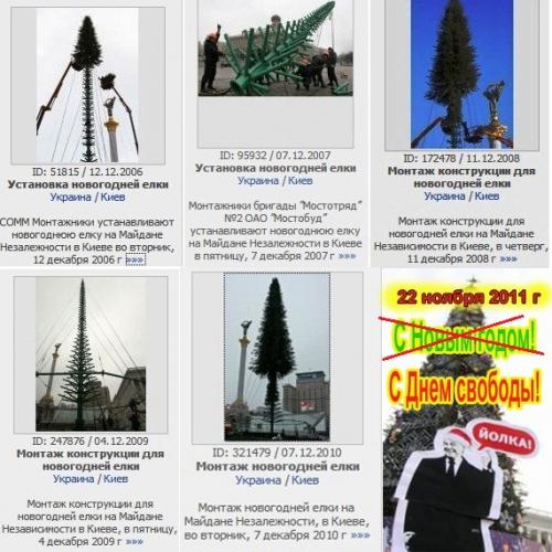В очередной раз высказав свой респект Елене Белозерской за предоставленные фото, отмечу, что в этом году столичная власть, начав устанавливать на Майдане новогоднюю ёлку в ноябре месяце, достойна: занесения в книгу рекордов Украины за самые ранние сроки установки новогодней красавицы и шоколадной медали на грудь за свой «двойной прогиб с переворотом»: и детям угодили, и Йолке …