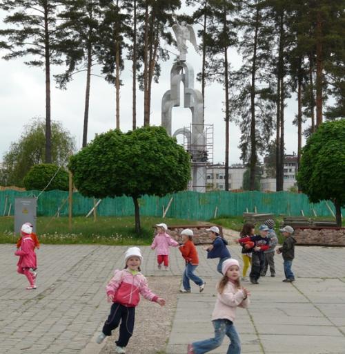 На центральной площади остановился, чтобы «щелкнуть» процесс монтажа статуи Белого Ангела. Чисто случайно в кадр попали резвящиеся дети. Именно ради их счастливого и мирного детства наши фронтовики и сражались с немецкими оккупантами с июня сорок первого года по май сорок пятого…