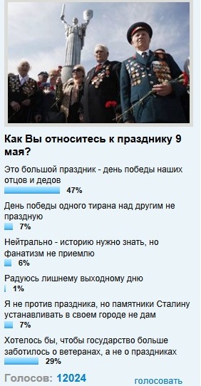 А для большинства украинцев День Победы, несмотря на все политические спекуляции, таки является одним из самых больших праздников. Или кто-то будет пытаться оспорить данные опроса сайта «Левый берег»?