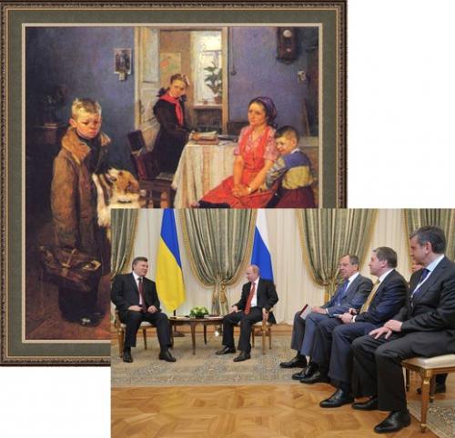 Януковичу вновь не нашлось места за общим столом. Встреча Путина и Януковича прошла в духе сюжета картины «Опять двойка»: ВВП общался с ВФЯ не тет-а-тет и не за обильным столом, а в присутствии «родственников, смотревших на Енакиевского лузера с укоризной».