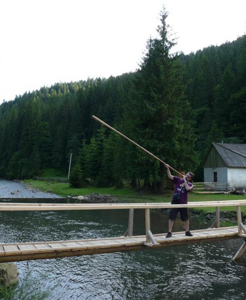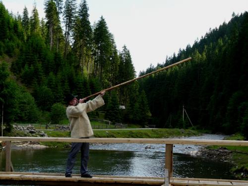 То, что не вышло у нас троих – получилось у Александра. Сразу видна пионерская закалка старого горниста! Да и смотрелся Саша с трембитой на фоне местного пейзажа весьма органично. Таких кадров можно смело использовать для рекламных постеров с призывом «Приезжайте в Закарпатье!».