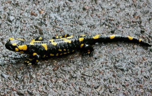 В Карпатах пятнистую саламандру называют «дождевой ящерицей». За то, что обычно она выходит кормиться ночью, а днем покидает свое убежище исключительно во время дождя. Так что в ясный солнечный день мы бы нипочем её не встретили прямо на дороге…