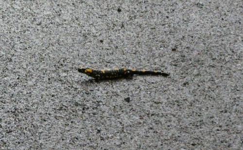 Вдоволь налюбовавшись необычной радугой, мы поехали дальше. На одном из поворотов наш гид резко бросил машину в бок и, увидев наши удивленные лица, пояснил: -- Саламандра! Мы, ес-но, попросили его остановиться, дабы посмотреть на эту легендарную живность, не встречающуюся у нас на Полесье.