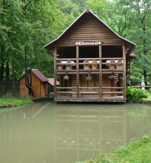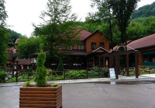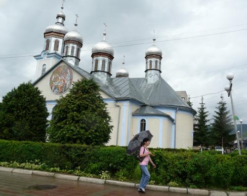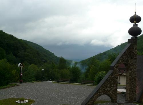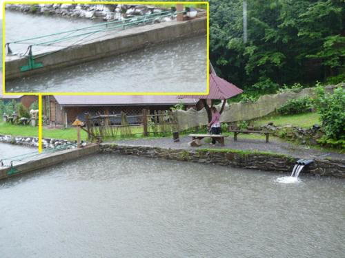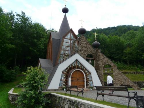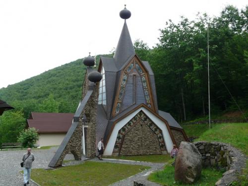 Туркомплекс «нафарширован весьма жирно»: помимо форелевого хозяйства, здесь есть отель и отдельные коттеджи, рестораны, бассейны, поля для мини-футбола, гольфа и большого тенниса, площадка для игры в пейнтбол, тир, боулинг, спа-центр и тренажерный зал, конюшня, квадроциклы, финская сауна, русская баня и знаменитые закарпатские серо-водородные чаны. Но особо впечатлила меня местная церквушка, ибо ничего подобного я ранее не встречал. Жаль, что не удалось побывать внутри, что посмотреть внутреннее убранство. Судя по огромным витражам, внутри церкви должно быть светло и красиво…