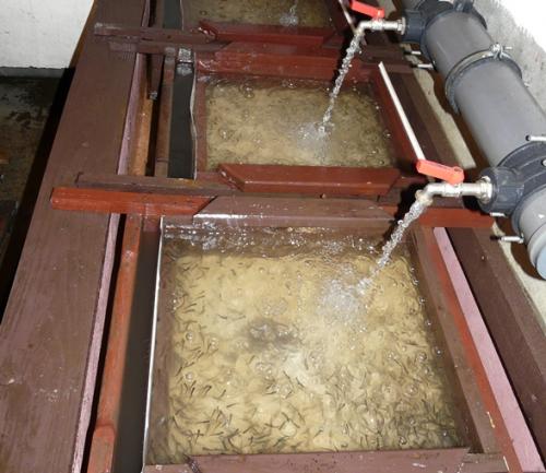 Заодно мы зашли посмотреть «форелевый детский сад» -- специальные мини-бассейны с проточной водой в которых держат мальков после инкубатория.