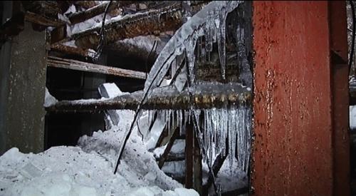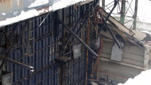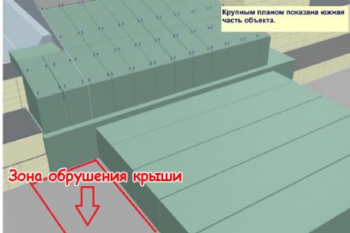 - Обрушение кровли и стеновых панелей машзала прошло по границе «легкой кровли» и «тяжелых щитов». И на фото хорошо заметно, что тяжелые щиты («южные блоки покрытия») лежат не на стене, а на специальной балке, держащейся на опорных мачтах. Более того, на снимке видно, что часть стеновых панелей машзала не упало только потому, что они уперлись в опорные мачты. К счастью, внутри машзала установлена дополнительная опорная стена, несущая основную нагрузку.