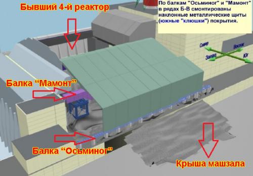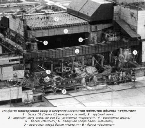 - Эти тяжелые щиты, в свою очередь, примыкают к наклонным щитам («южным клюшкам») расположенным на балках «Мамонт» и «Осьминог». Малейшее смещение которых чревато «эффектом домино» -- обрушением всех остальных конструкций непосредственно над разрушенным реактором. То есть тем местом, где и расположена «вся таблица Меделеева».