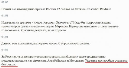 Хм, и еще раз об оценках нашей северной соседки. Наивысшую оценку в 12 баллов России поставили две прибалтийские страны -- Латвия и Эстония. Украина поставила России 4 балла. Не щедро, конечно. Но некоторые российские журналисты умудрились этой оценки вообще не заметить.
