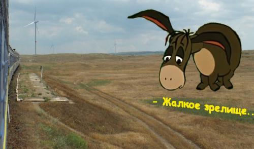 Самым живописным видом в Крыму, открывающимся из окна поезда, является, безусловно, подъезд к Севастополю. А степной Крым, особенно в период засухи – банален и скучен. В мае с дождями как-то не сложилось, а потому пейзажи от Джанкоя, мягко говоря, не возбуждали. И такой пессимист как мультяшный ослик Иа наверняка произнес бы известную всем фразу: -- Жалкое зрелище… Душераздирающее зрелище... Кошмар!