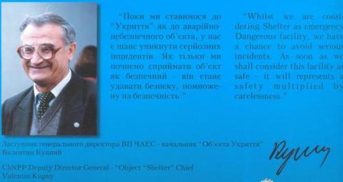27 лет назад -- 30 ноября 1986 года был подписан акт Государственной комиссии о принятии на техническое обслуживание объекта «Укрытие». Накануне очередной годовщины на глаза попалась старая фирменная папка, на которой процитированы слова Валентина Купного (экс-директора ОУ – прим.авт.):