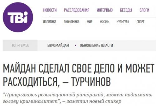 Санек Турчинов, по собственной дурости потерял бдительность и пустил пузыри радости, брякнув во всеуслышанье «Майдан достиг всех поставленных целей, люди смогут спокойно отправиться домой». //ru.tvi.ua/new/2014/02/22/majdan_sdelal_svoe_delo_i_mozhet_raskhoditsya___turchinov Дескать, всем спасибо, все свободны!