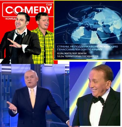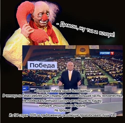 Из последней передачи от 30 марта я приведу только краткую выдержку из свежих перлов Киселева: его подачу новости о голосовании Генассаблеи ООН по Украине. Ну той самой, которую в украинских СМИ позиционировали, как неприятие цивилизованным миром аннексии Крыма. А вот как ту же самую новость прокомментировал Димон:
