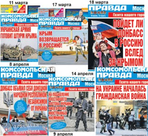 Кстати, о каскадной реализации Плана Путина. Его наглядное подтверждение хорошо просматривается по передовицам российской прессы. К примеру, такого издания как «Комсомольская правда»: глядя на даты и заголовки, четко просматривается, как после аннексии Крыма свежим плацдармом вторжения стал именно Донбасс.