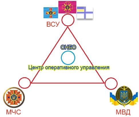 В зависимости от «вызова дня»: а) стихийное бедствие, масштабная авария; б) внутренние беспорядки; в) внешнее вторжение – во главу треугольника ставятся соответствующая структура, в две остальные выполняют функцию поддержки и обеспечения.