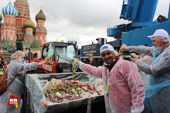 Фраза «более тысячи человек», конечно, может означать всё что угодно: от «тысяча и одного гражданина» до полутора тысяч. Однако автор предлагает довести эту цифру до двух тысяч счастливчиков, на которых пришлось 20 тонн салата. Получается, что каждый из россиян, способен за один присест сожрать не менее 10 кило (!!!) съедобной массы.