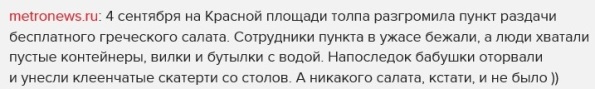 Ну тот факт, что организованной раздачи салата зрители так и не дождались, ибо толпа тупо разгромила пункт раздачи «халявы», удовлетворившись пустыми контейнерами и вилками – вы, наверняка и так знаете.