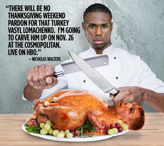 "Этой индейке Василию Ломаченко не будет пощады в День благодарения. Я собираюсь разделать его в прямом эфире", - запостил ямаец свой твит в Сети, сопроводив свои слова соответствующей фотожабкой: