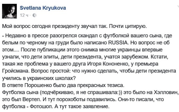 Светлана Крюкова, умничка -- наконец-то задала вопрос о футболке сына Президента, и о том, что нужно сделать, чтобы дети украинских чиновников учились в Украине?