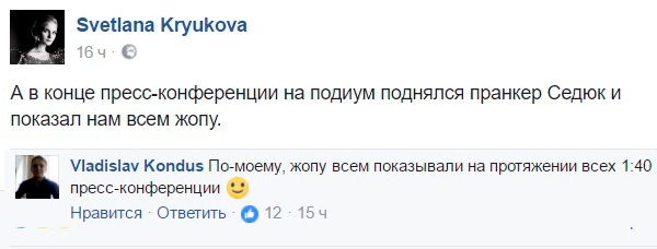В общем, после пресс-конференции Президент должен уходить вспотевшим и измочаленным, шо та бюджетная проститутка, обслужившая полк солдат. А не счастливым, шо та блядь, которая внаглую "прокрутила динамо"…