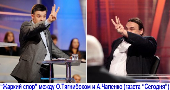 И ржал с пафосной фразы в анонсе программы: «Лидер ВО "Свобода" Олег Тягнибок готов к дуэли в прямом эфире сразу с пятью идеологическими оппонентами» (ну просто «храбрый портняжка» какой-то: "Единым махом семерых побивахом!")