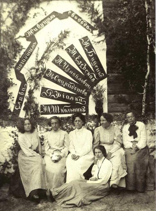 В первом ряду - справа от мужчины в белой папахе - Мария Александровна Спиридонова ( на момент съемки 22 года) (смертельно ранила в Тамбове губернского советника Луженовского в 1906 году пять пуль в упор) Впоследствии руковидитель партии эсеров.