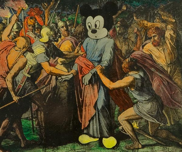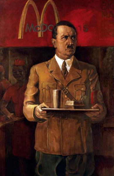 Однако заваленный икрой лик Божьей Матери не виден, остается только золотой оклад, показывая истинные ценности для американцев в этих брендах (материальные). Но тем самым показывая и свое отношение к ним – получение прибыли от удачно проданной работы. Используя последнее оставшееся в мире табу (очень популярная маркетинговая тема - см. Дэн Браун) – на религию, (даже не на всякую, а только на христианскую, как наименее агрессивную), Косослапов активно внедряет лики Бога в рекламные плакаты Мак Дональдс, приделывает ему голову или тело Микки Мауса, и другие узнаваемые в США фишки(до этого он работал с Лениным и соцреализмом).