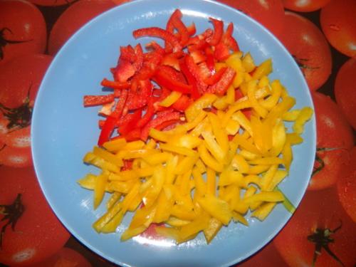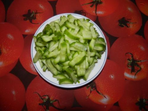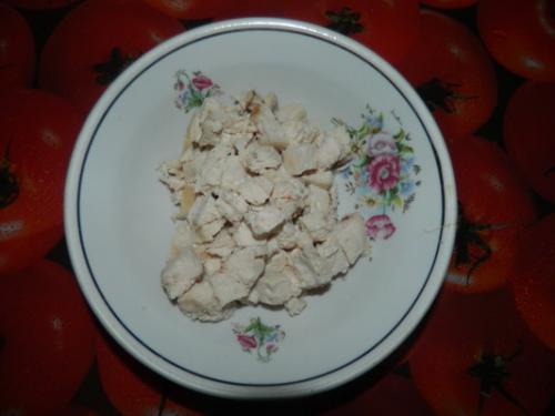 Тем временем сварилась, и остыла курочка, начнем резать и ее.