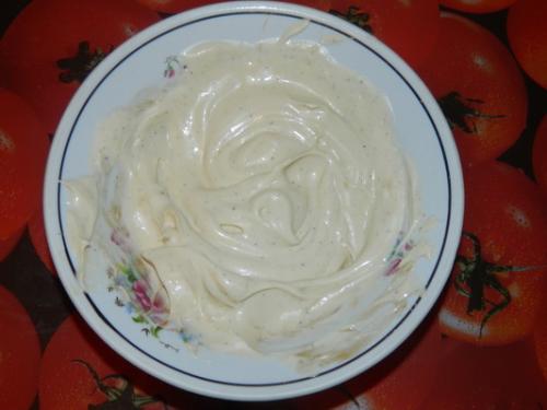 Когда уже все нарезано, будем приступать к заправке. Высыпаем майонез в тарелочку, добавляем ложку бальзамического уксуса, соль и перец (по вкусу) и размешаем.