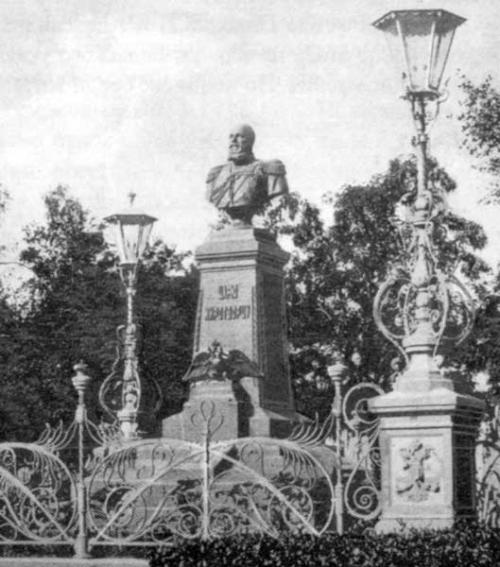 Но этой фотографии я не особенно верю. Оградка вроде бы та же, постамент - тоже (но мало ли таких постаментов на бывшем просторе Российской империи?), но фонари - другие!