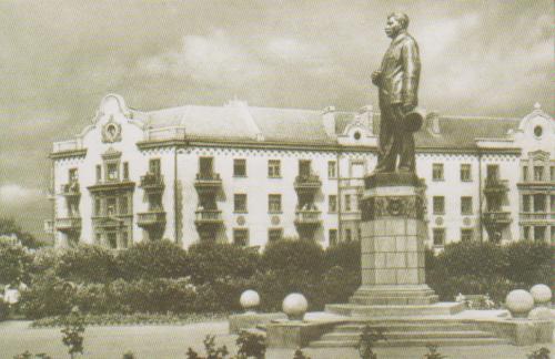 Доподлинно известно, что перед войной или в самом начале войны бронзовый бюст то ли Ленина, то ли Фрунзе исчез, как бы испарился, точно так же, как и в начале революции исчез бронзовый бюст Александра III. Никто и ничего об этом не пишет и не знает, полная и зловещая тайна. Орел, цепь, фонари - это тоже пропало, сгинуло. И стоит сейчас бюст Михаила Фрунзе с отбитым носом, грустно взирая на такие же разбитые дороги.