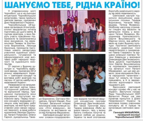 Сейчас я работаю в Чернобыле и про своё непосредственное начальство (Ген.директор ГСП "Чернобыльский спецкомбинат" - Кушниренко Сергей Николаевич, дир.комплекса ЖКХ - Федосенко Екатерина Васильевна) могу сказать только хорошее. Дом Культуры сохранён до сих пор и даже находятся средства на его ремонт. Терком профсоюза (Представитель "Атомпрофсоюза" - Тетерин Николай Васильевич, вед.эксперт - Михайлюк Геннадий Александрович) так же поддерживают участников самодеятельности, оказывая всяческую поддержку для проведения концертов и выcтавок народного творчества. Приятно писать подобные вещи, ничуть не кривя душой!